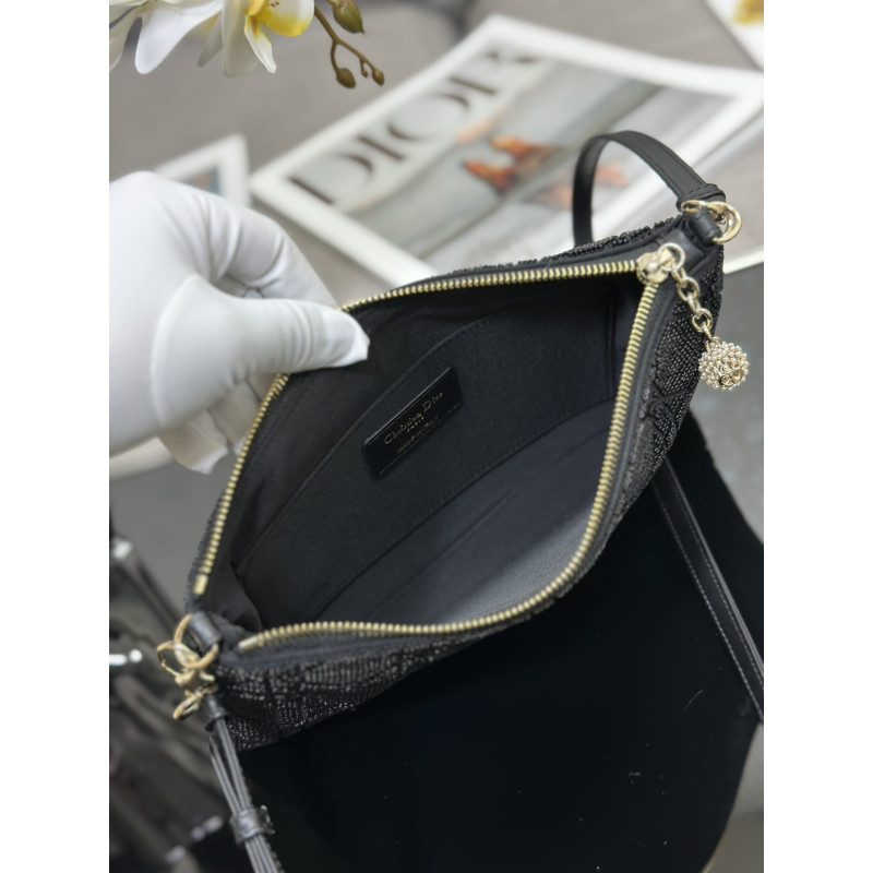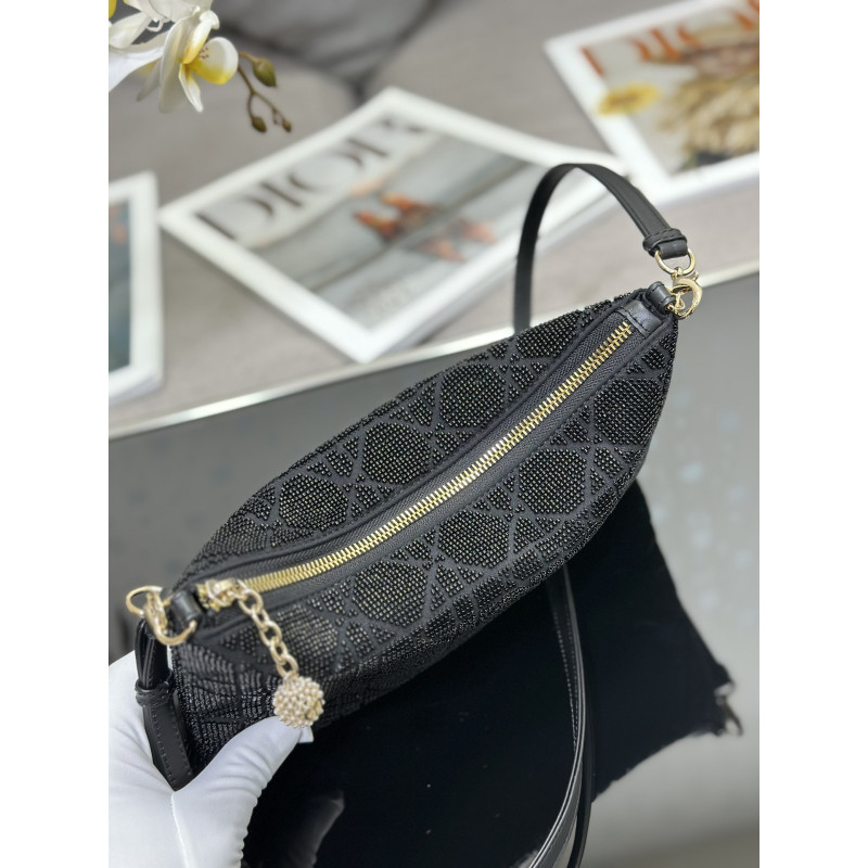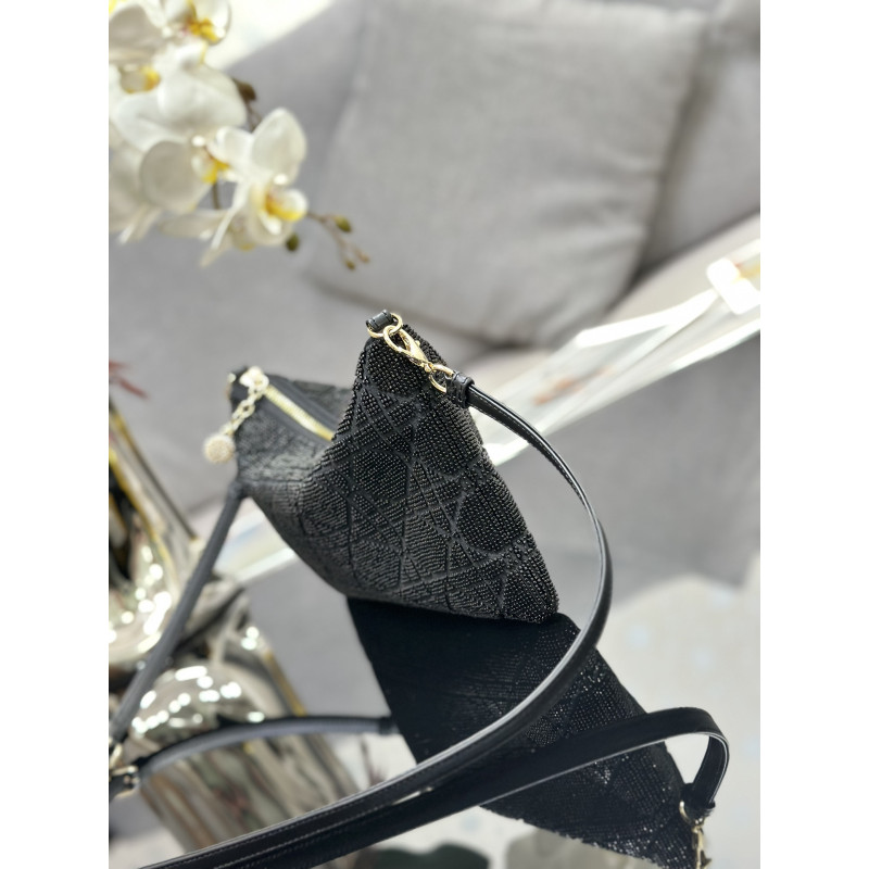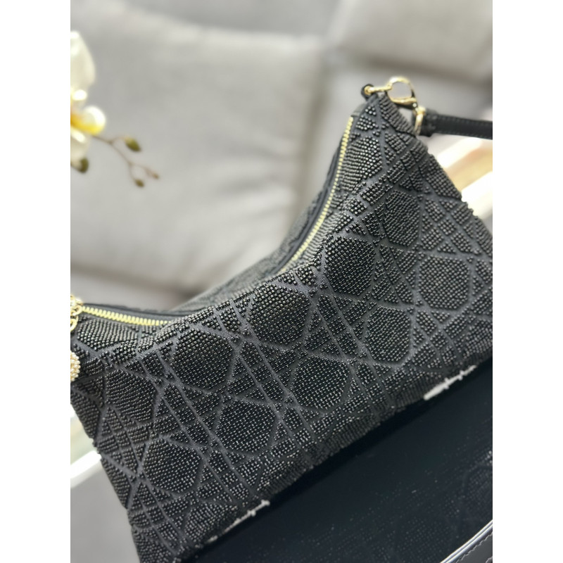 It features a classic cannage pattern. Hand-embroidered with 2mm glass beads. The adjustable and detachable leather spaghetti strap adds sophistication and adds elegance to evening looks.