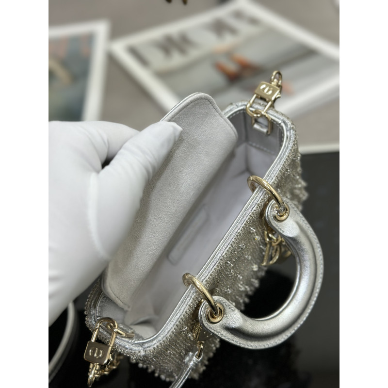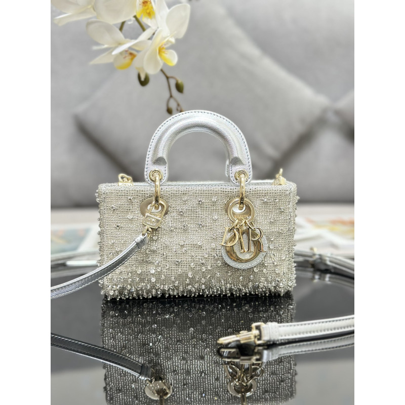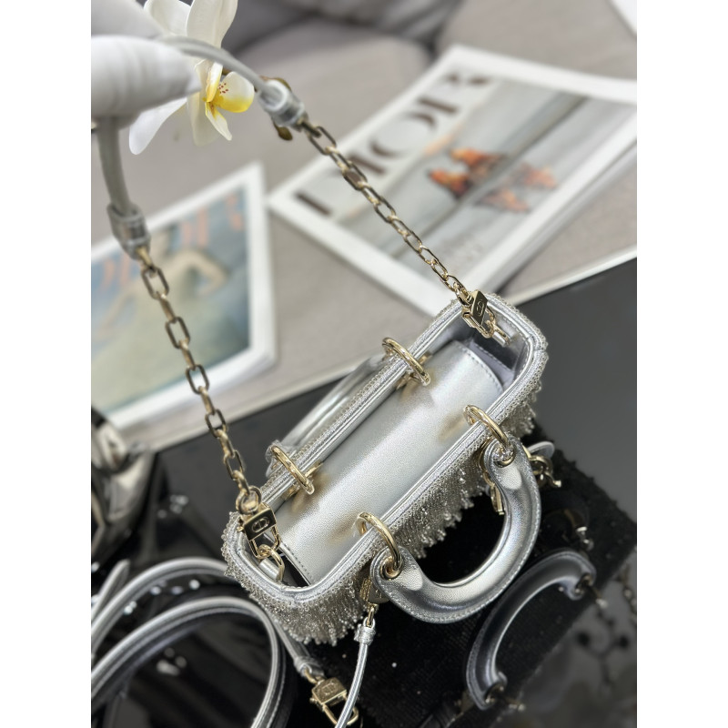 DetailExtra-miniature embroidery beads. Crafted in tonal satin, it's enhanced with ombré-effect beaded embroidery and a D.I.O.R. charm in light gold-finish metal. With a detachable chain shoulder strap and an adjustable, detachable leather shoulder strap, it can be carried by hand, on the shoulder or across the body, making it ideal for everyday or evening looks.