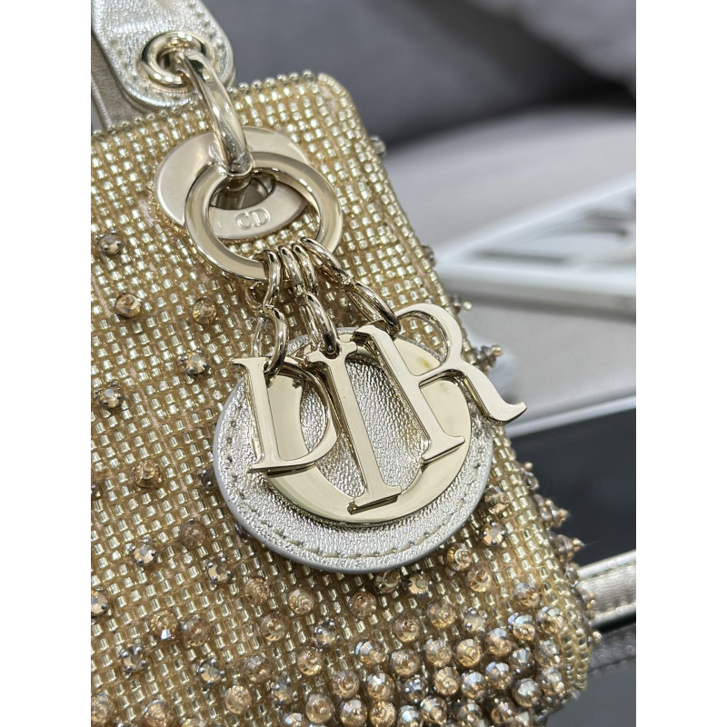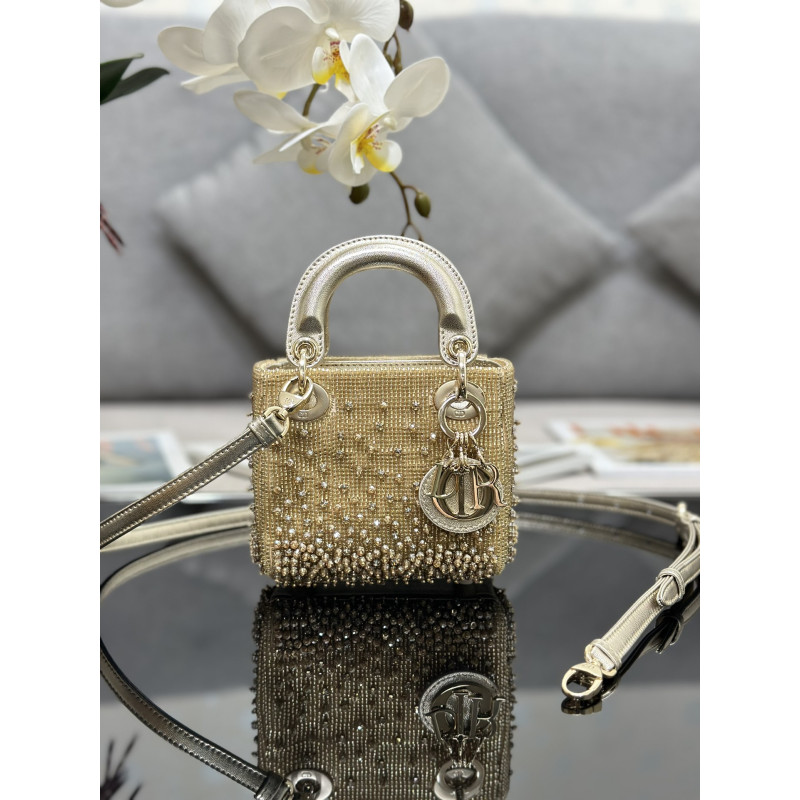 Extra-miniature embroidery beads. Crafted in tonal satin, it's enhanced with ombré-effect beaded embroidery and a D.I.O.R. charm in light gold-finish metal. With a detachable chain shoulder strap and an adjustable, detachable leather shoulder strap, it can be carried by hand, on the shoulder or across the body, making it ideal for everyday or evening looks.