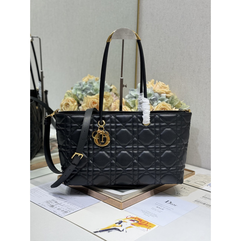 DetailThis Dior Toujours handbag is meticulously crafted from black calfskin, featuring oversized Cannage topstitching. Its spacious interior compartment allows for neat storage of daily essentials. The structured top handles, adorned with vintage-finish metal accents, offer effortless hand-carry options, while the adjustable leather shoulder strap provides versatile styling.