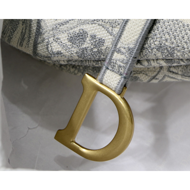 Embroidered with the Toile de Jouy motif, it reveals a saddle flap with a magnetic D-shaped stirrup clasp, as well as a CD signature in antique gold-finish metal on either side of the shoulder strap. This saddle bag has an adjustable and detachable spaghetti strap and can be carried by hand, over the shoulder or across the body.