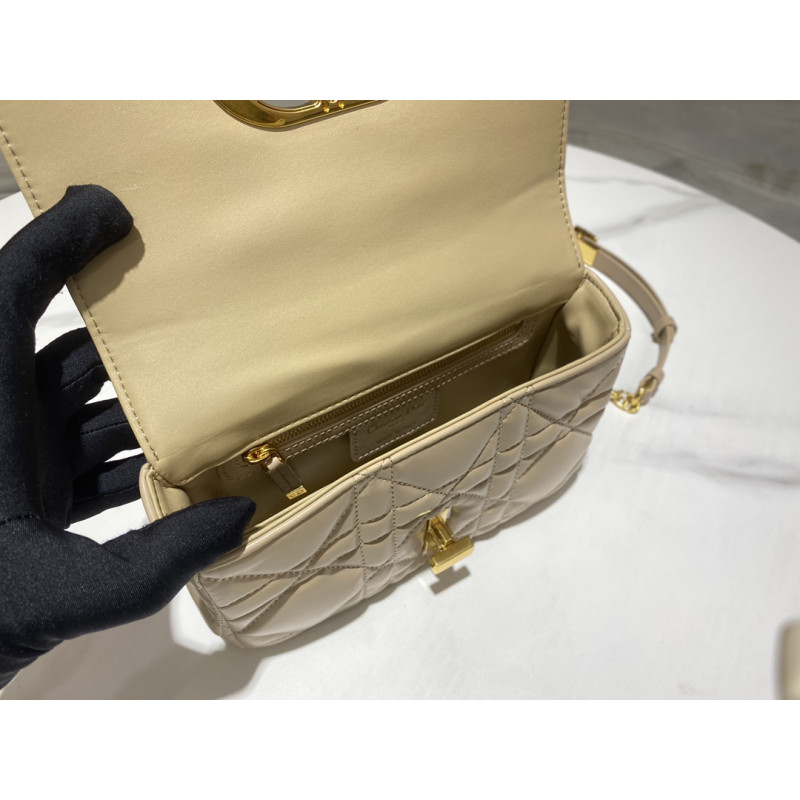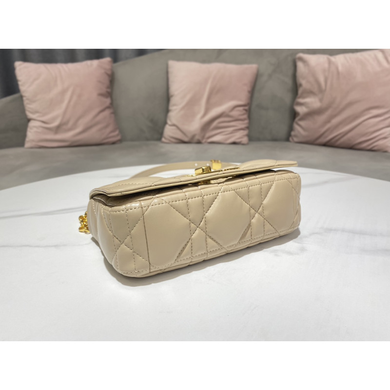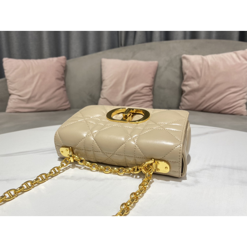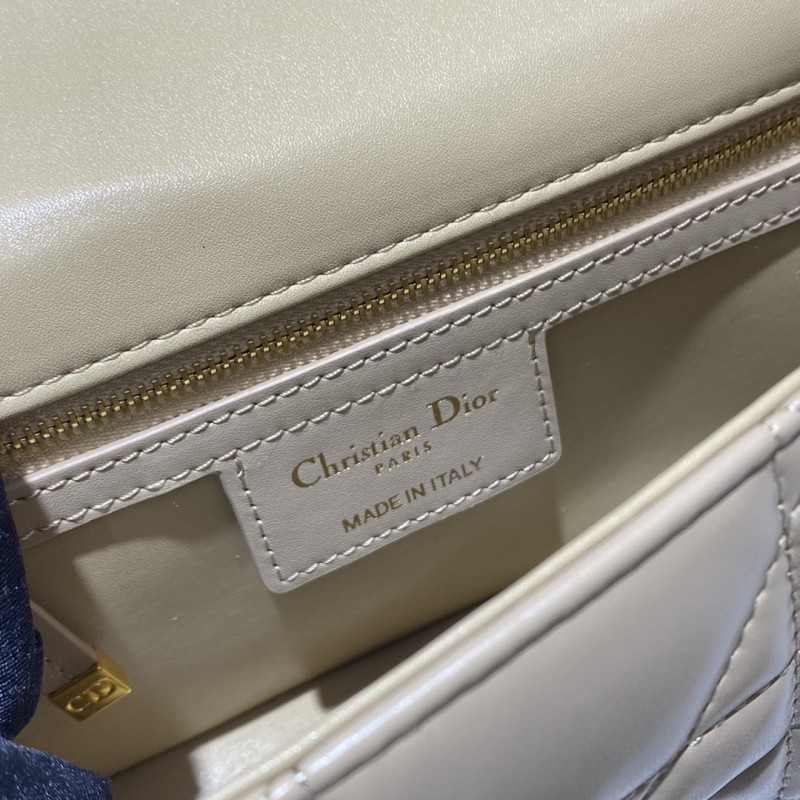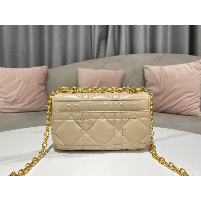 Crafted from calfskin with Cannage stitching. Antique gold-plated metal 'CD' button on the flap, adjustable and detachable chain shoulder strap with 'CD' logo links, can be carried by hand, shoulder or crossbody, and can be matched with different embroidered shoulder straps.