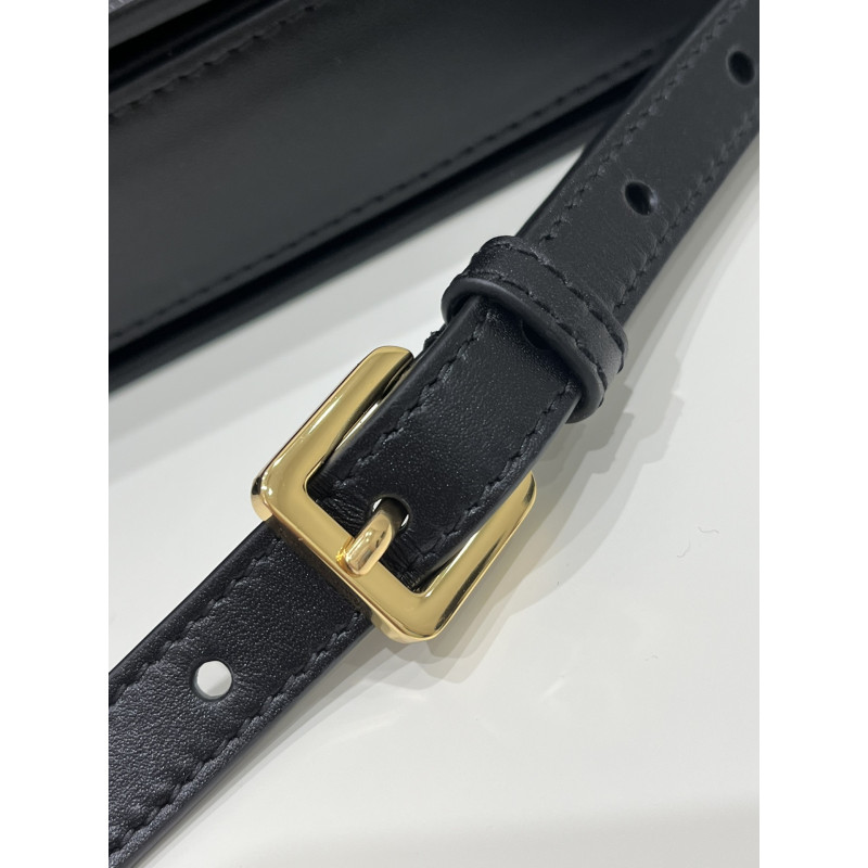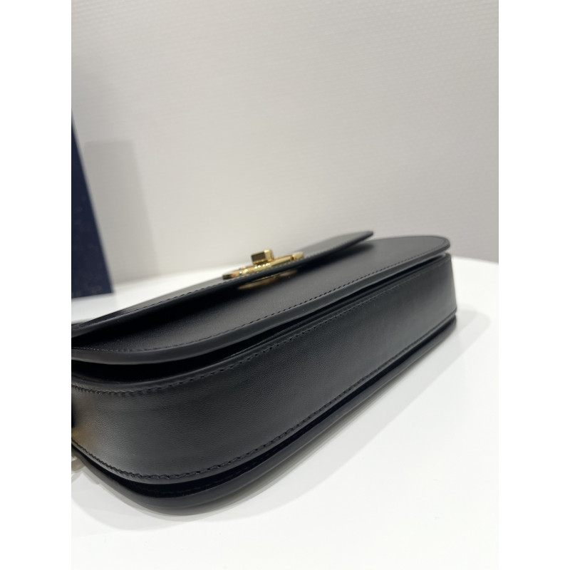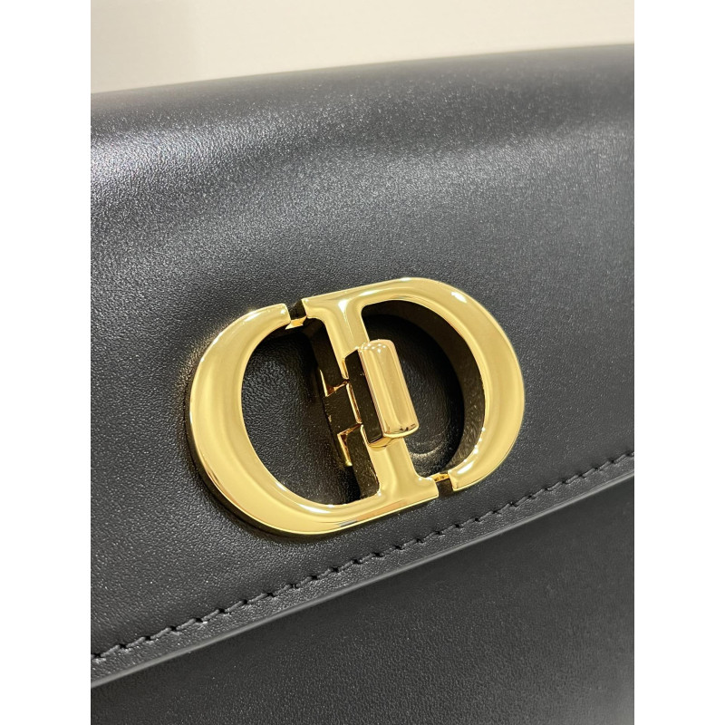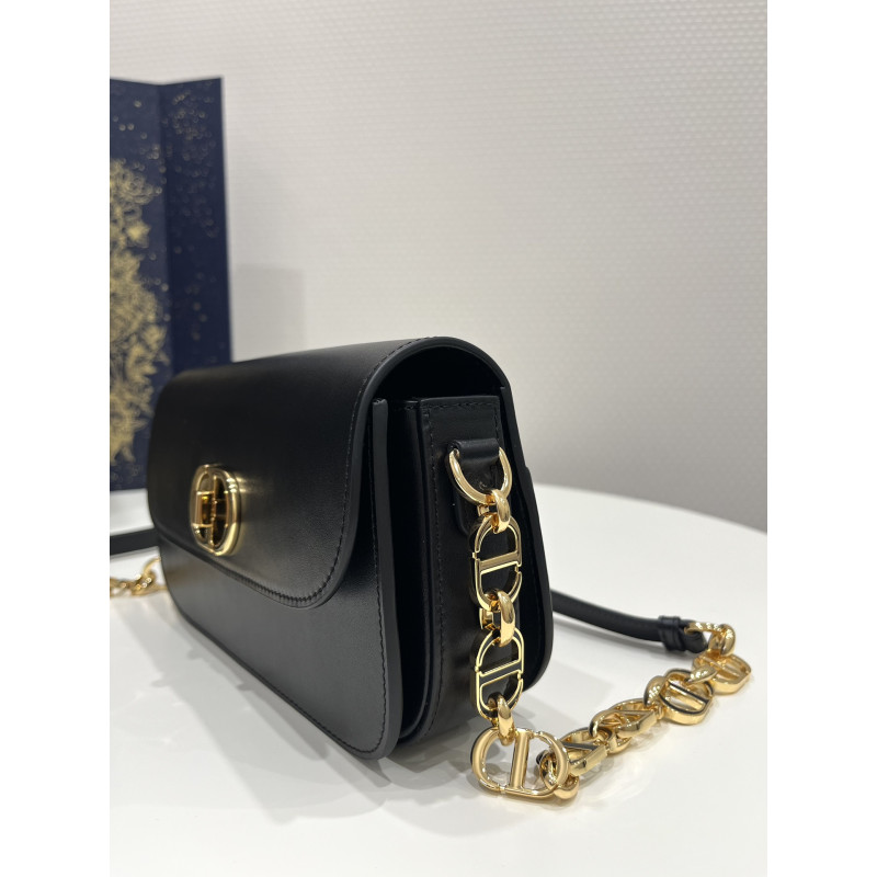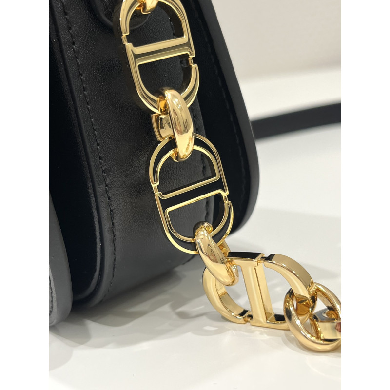 Round flap crafted in calfskin with antiqued gold-plated metal CD clasp, 30 Montaigne logo embossed on the back, and a signature chain with alternating gold-finish metal and tone-on-tone enamel links to match the leather, adjustable. The bag is roomy and refined in shape and can be carried in the hand, over the shoulder or across the body.