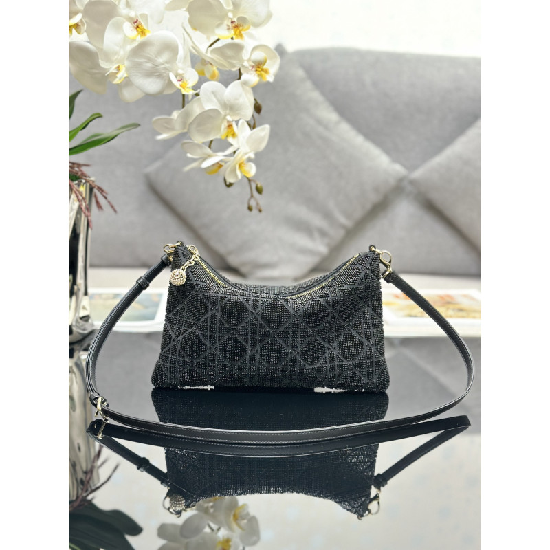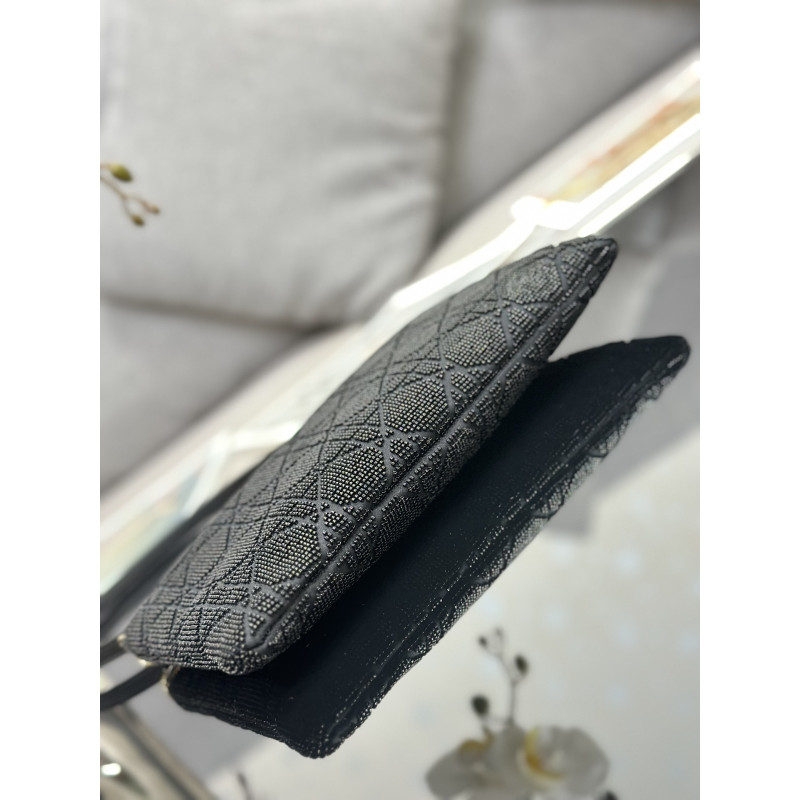 It features a classic cannage pattern. Hand-embroidered with 2mm glass beads. The adjustable and detachable leather spaghetti strap adds sophistication and adds elegance to evening looks.
