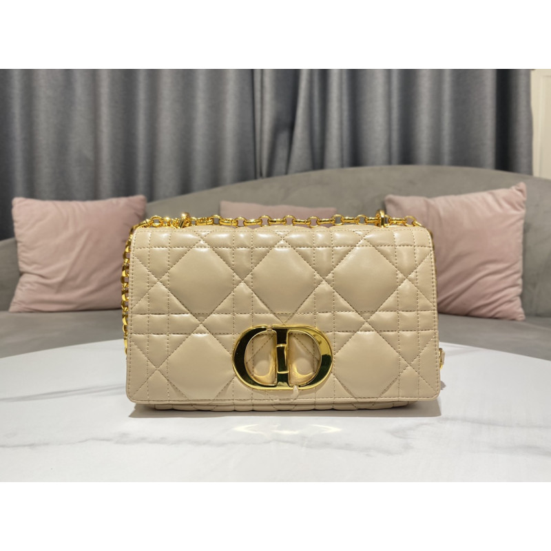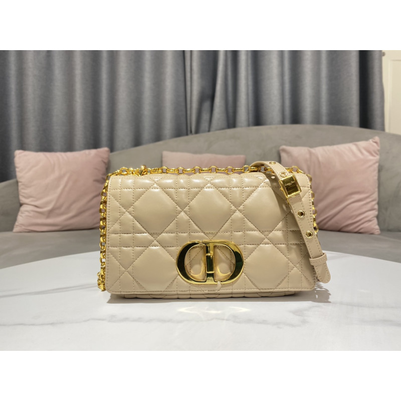 Made of calfskin with Cannage stitching. Fitted with flap, decorated with antique gold-plated metal 'CD' turnbuckle, adjustable and detachable 'CD' chain shoulder strap with 'CD' logo links, can be carried by hand or on the shoulder, can be matched with different embroidered shoulder straps.