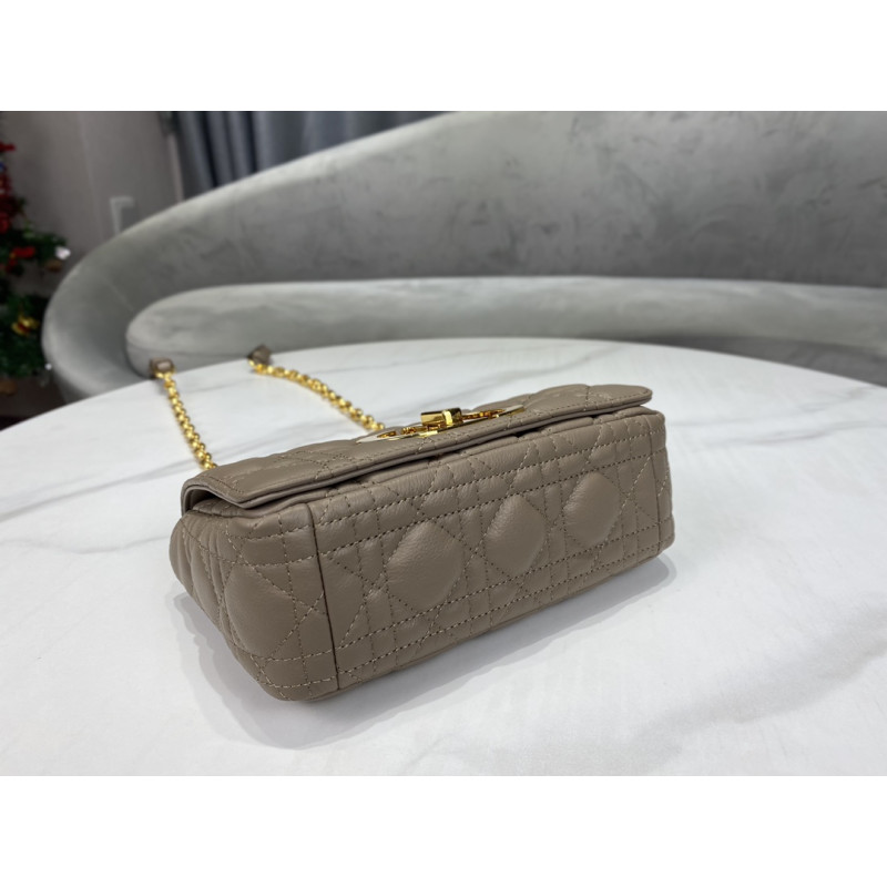 Crafted from calfskin with Cannage stitching. Antique gold-plated metal 'CD' button on the flap, adjustable and detachable chain shoulder strap with 'CD' logo links, can be carried by hand, shoulder or crossbody, and can be matched with different embroidered shoulder straps.